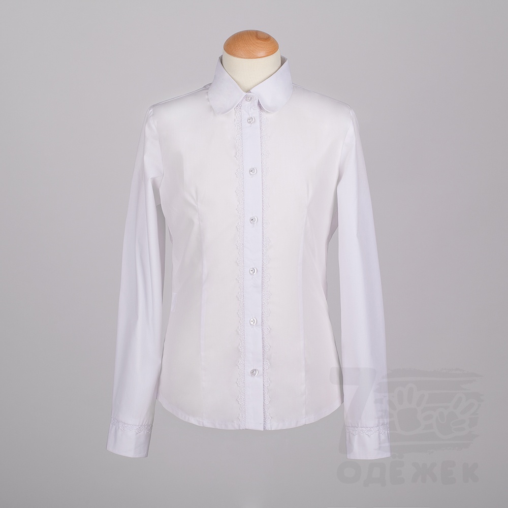 Вертикальная планка с застежкой на пуговицах со стразами, декорирована по всей длине изящной кружевной лентой с волнистым краем. Скругленный низ с разрезами по бокам позволяет носить блузку навыпуск. Идеальна как для школы, так и для торжественных мероприятий.